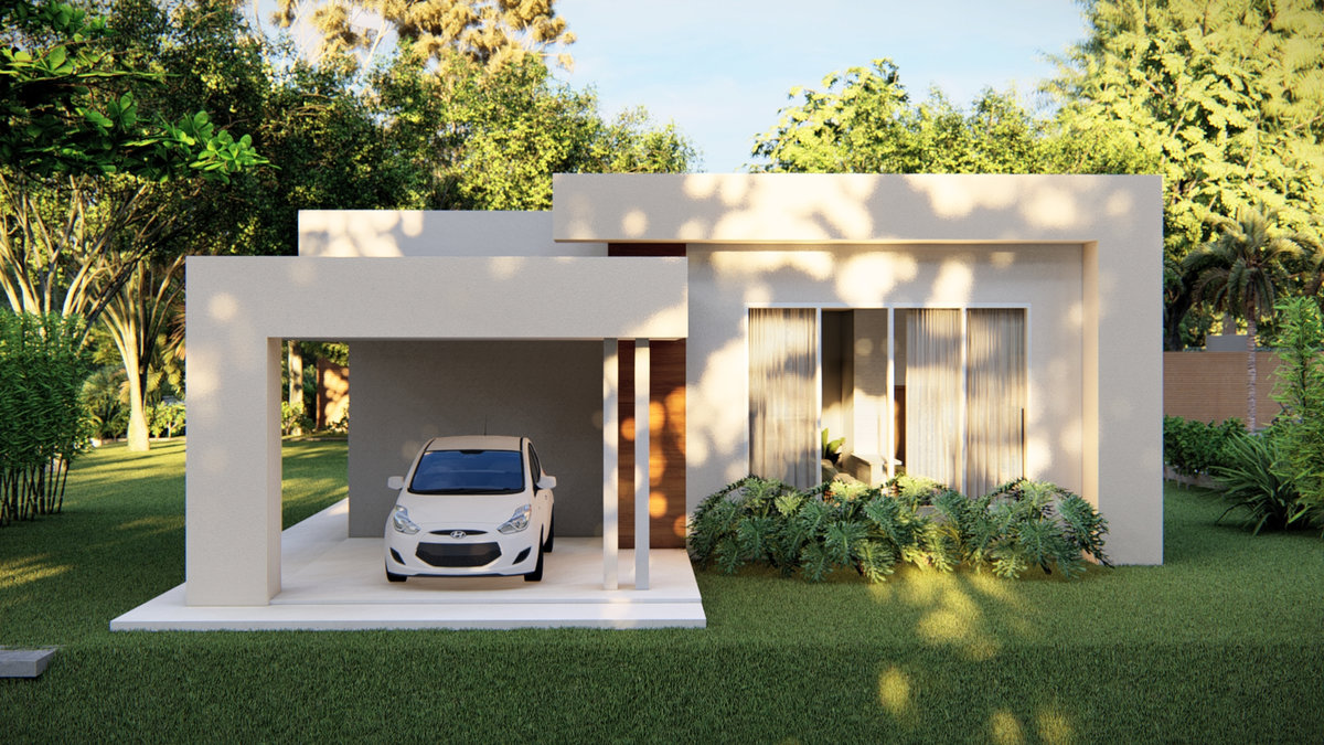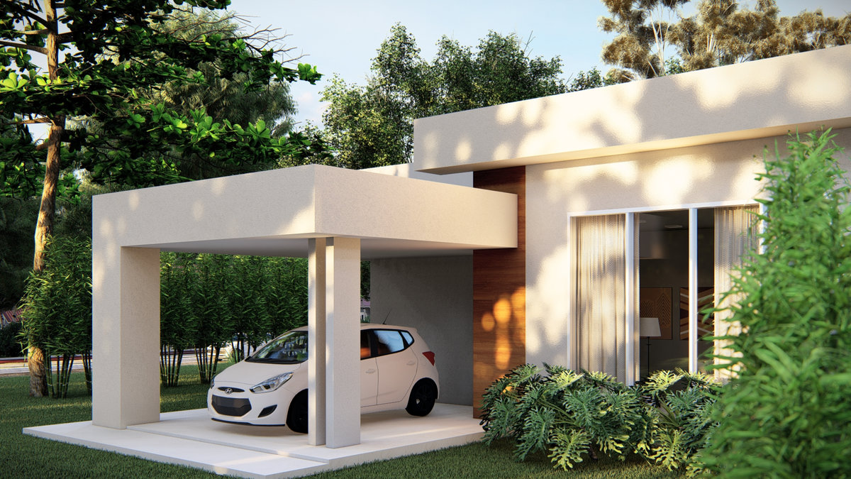 Com 90m², esta residência foi projetada para oferecer conforto e funcionalidade em cada ambiente. A planta contempla garagem, quarto, suíte, banheiro social, cozinha integrada à sala de estar e lavanderia — uma composição prática e bem distribuída para o dia a dia. Na fachada, os elementos lineares, aliados aos revestimentos externos, conferem leveza e sofi sticação ao volume arquitetônico. A escolha dos materiais e cores reforça a estética contemporânea e atemporal da proposta. A integração com a paisagem é um dos pontos centrais do projeto. O verde ao redor abraça a casa, criando uma atmosfera de tranquilidade e refúgio. A iluminação natural, cuidadosamente pensada, valoriza texturas, volumes e realça a geometria da construção ao longo do dia. Mais do que um espaço físico, esta casa representa a essência do lar: um lugar onde estética e funcionalidade se encontram para proporcionar bem-estar, calma e pertencimento.